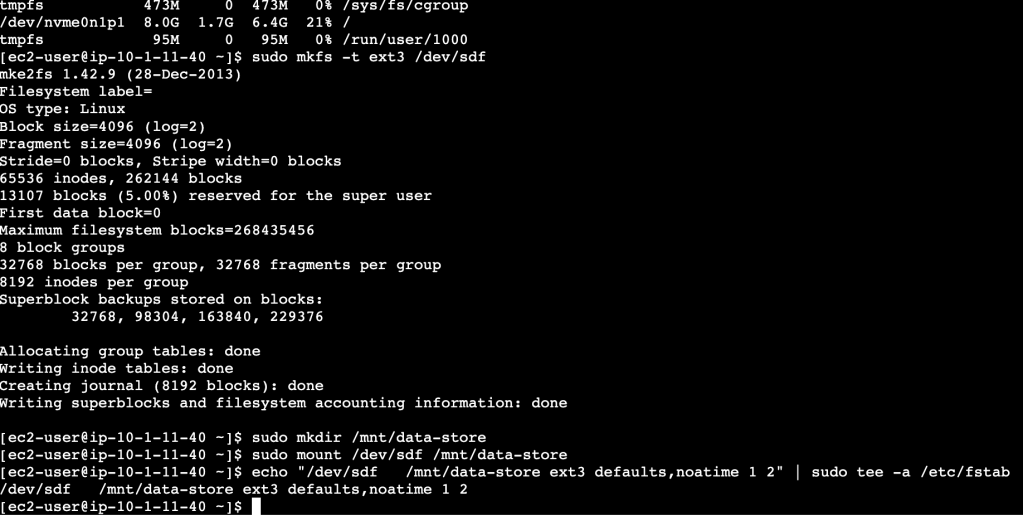 $ echo "/dev/sdf /mnt/data-store ext3 defaults,noatime 1 2" | sudo tee -a /etc/fstab # ensure the volume is mounted even if/when the instance is restarted