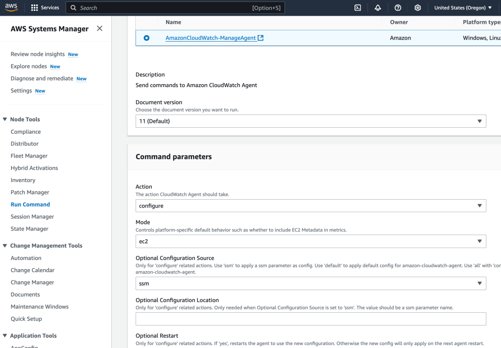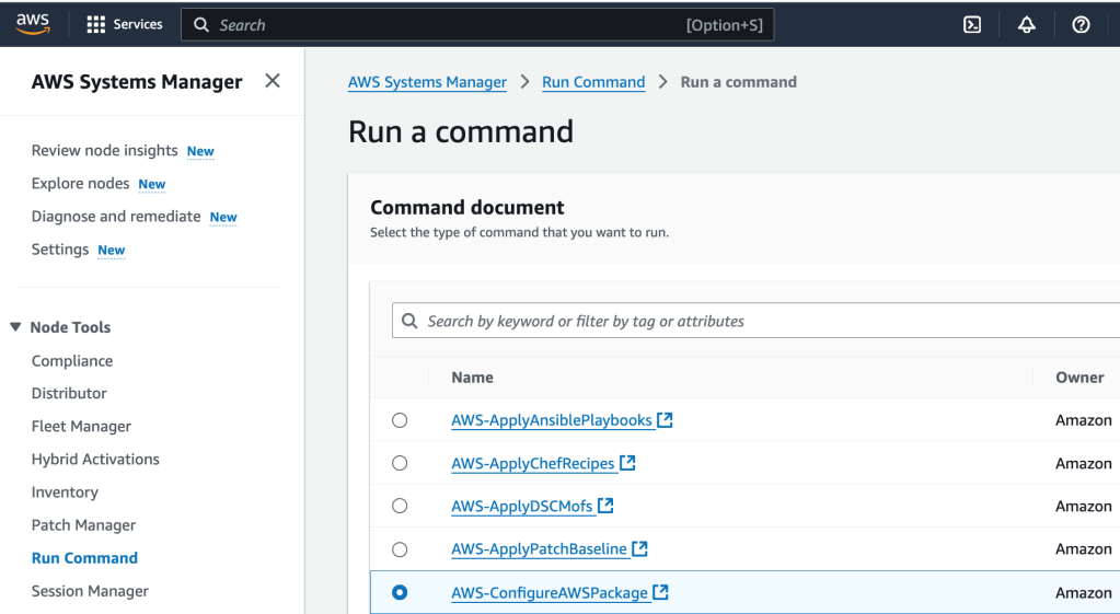 So let’s start with that. We are going to install the CloudWatch agent onto the ec2 instance using Systems Manager. First, I select Systems Manager as a service, and then, under Node Tools, select Run Command. Then I select ‘Run a Command’. I select ‘AWS-ConfigureAWSPackage’. That package description is: