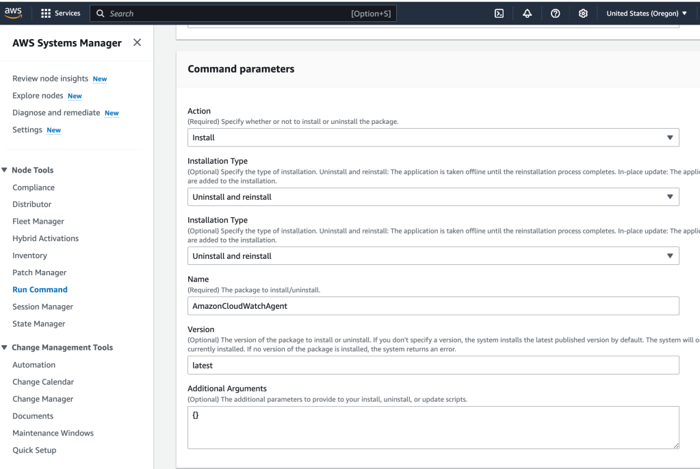 “Description: Install or uninstall a Distributor package. You can install the latest version, default version, or a version of the package you specify. Packages provided by AWS such as AmazonCloudWatchAgent, AwsEnaNetworkDriver, and AWSPVDriver are also supported.”