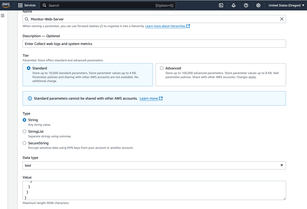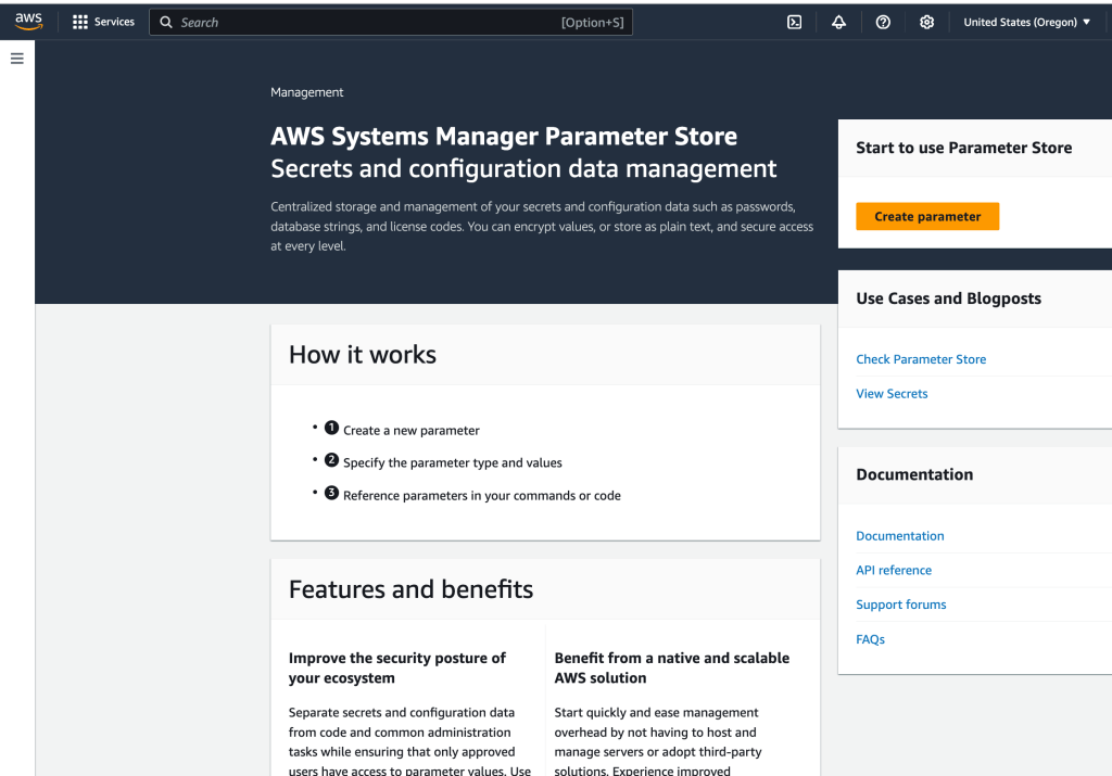 The goal here is to store the configuration file (for the agent) in AWS Systems Manager Parameter Store, which the agent can access. So, I select Parameter Store, under Application Tools, from within AWS Systems Manager.