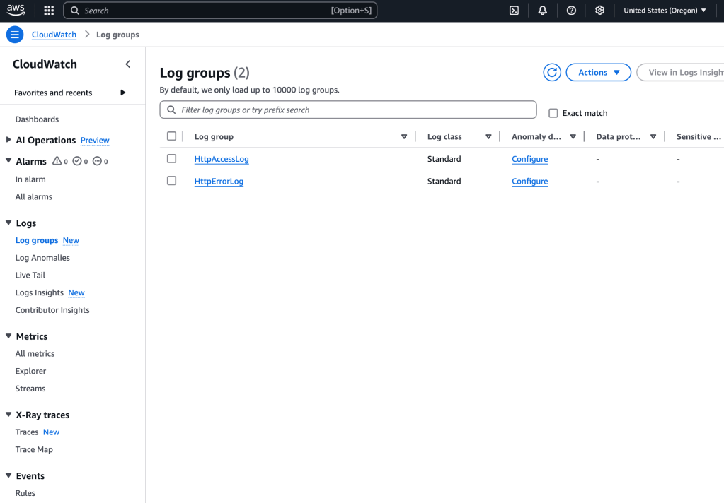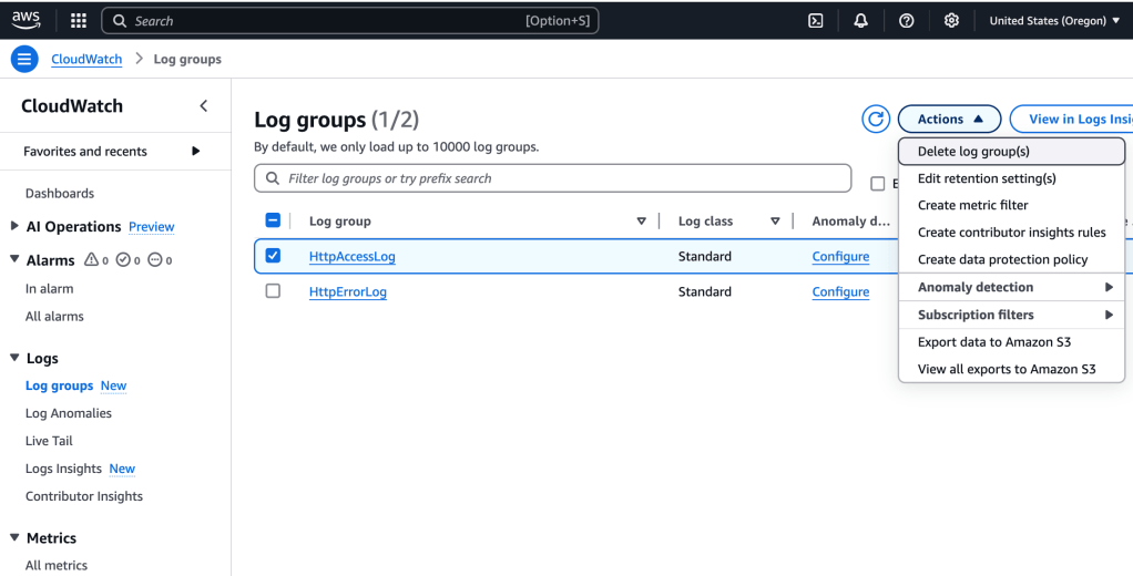 I select CloudWatch in the services, and then Log Groups.