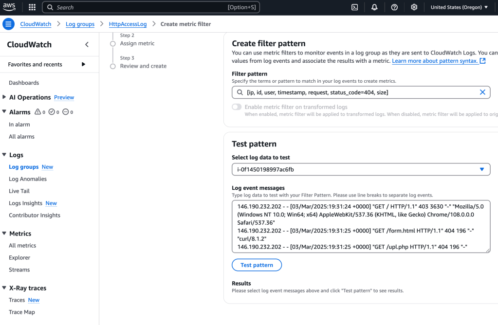 For the filter pattern, I use the following line, which tells CloudWatch Logs how to interpret the fields in the log data and defines a filter to find lines only with status_code=404, which indicates that a page was not found: