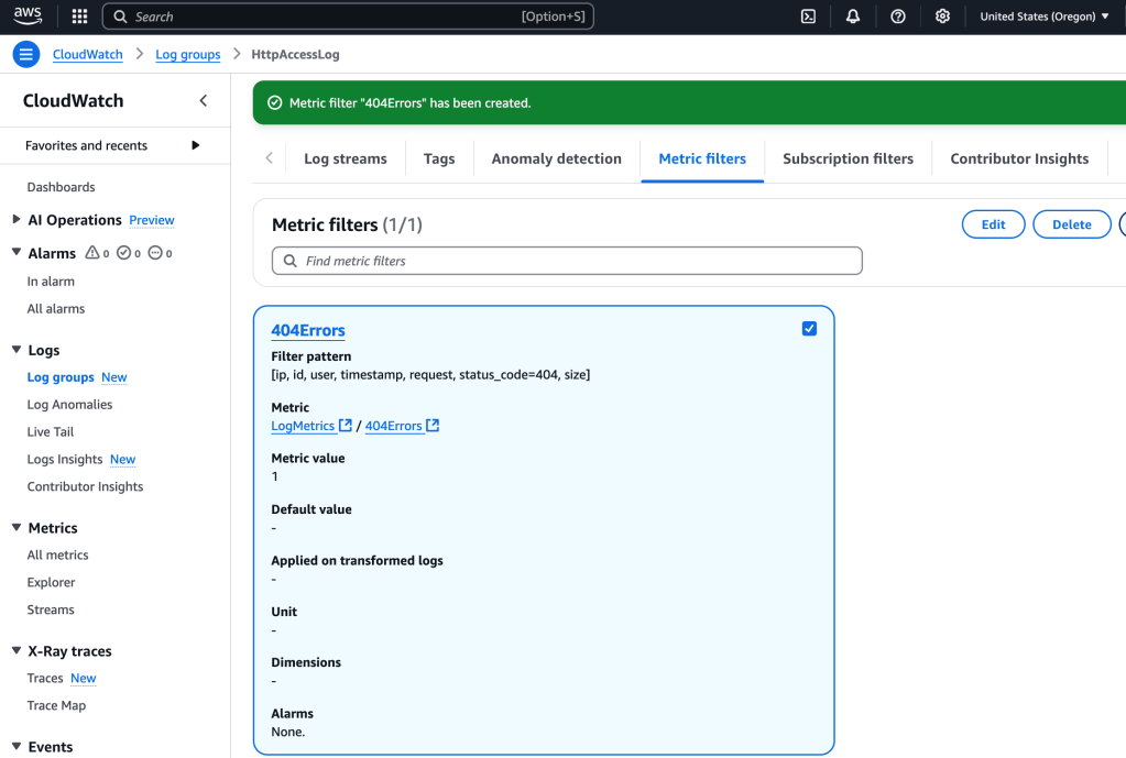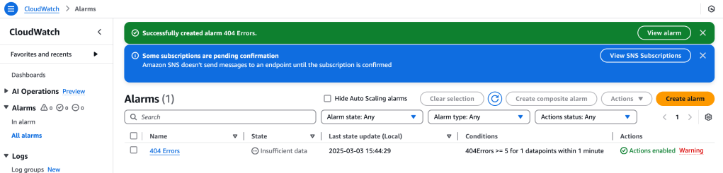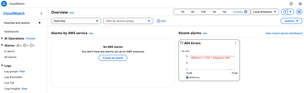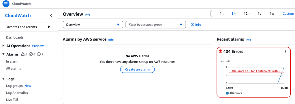 Back on the main CloudWatch page, I can view the Alarms, including the one we just made, 404 Errors: