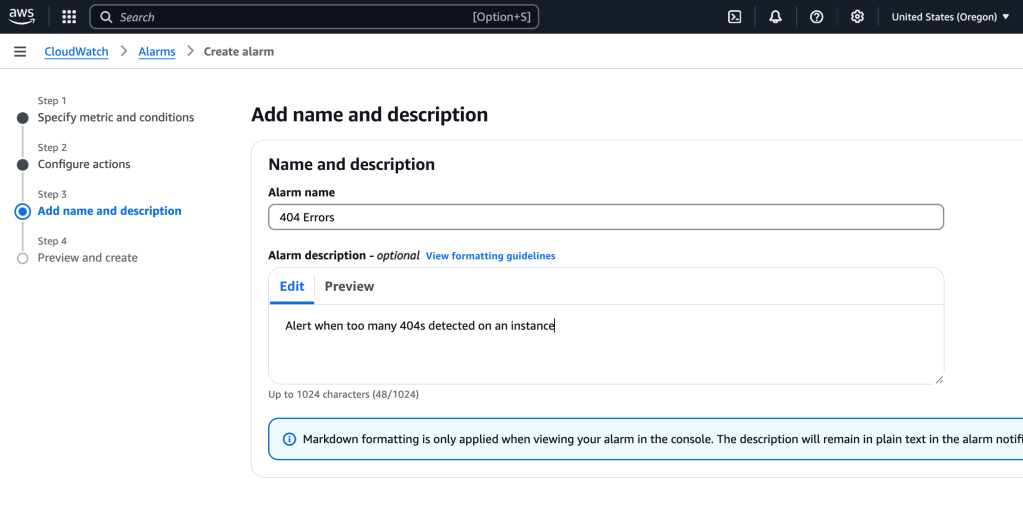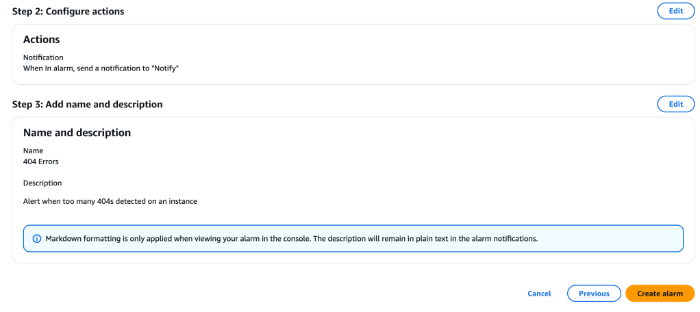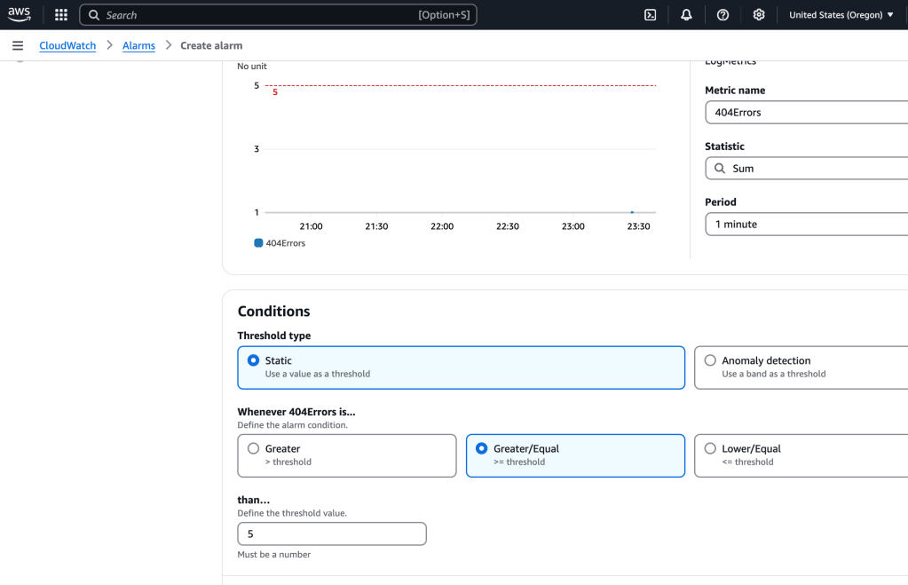 So we have created a filter that searches the logs looking for a match for the 404 Not Found error. We would like to create an alarm which will send a notification when too many of these are received- potentially an indicator of something amiss that needs to be addressed quickly.