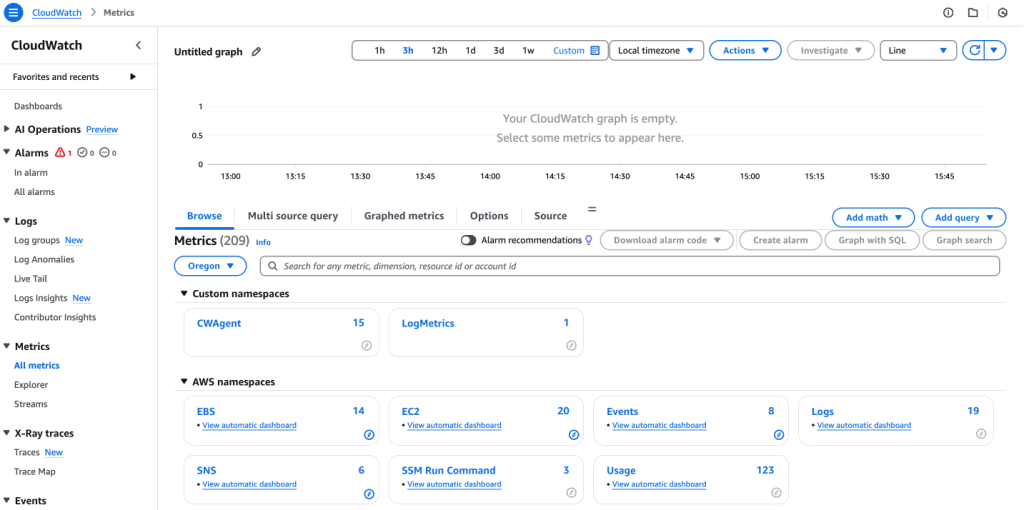 Back in CloudWatch service, I select Metrics > All metrics: