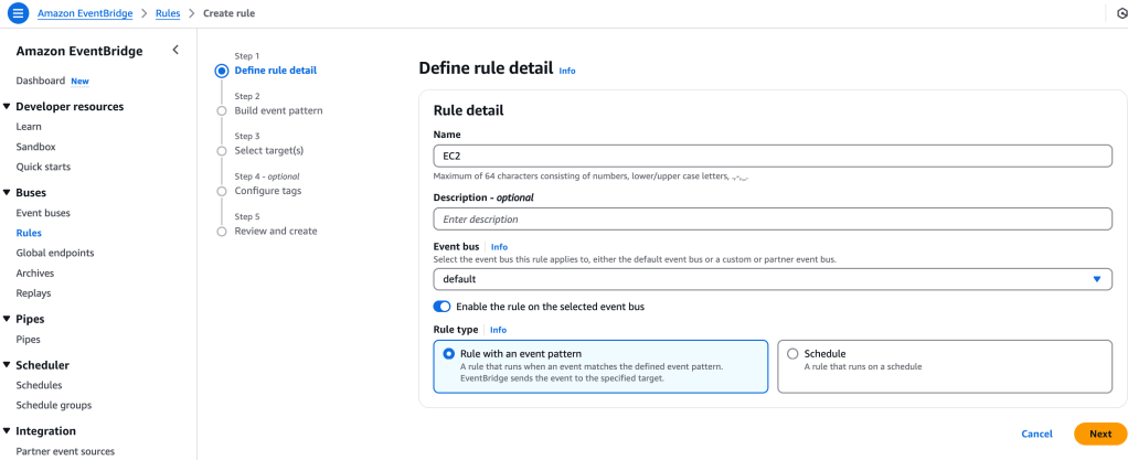 Still within CloudWatch, I select Events > Rules > Create Rule: