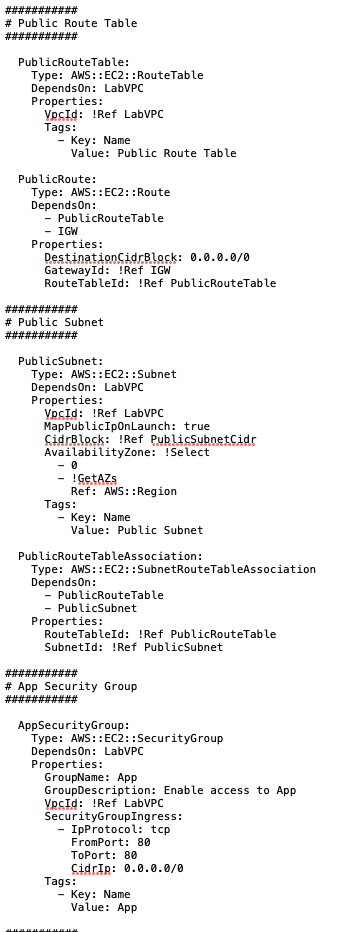 For my configuration file, I’ll be building out a VPC with Internet Gateway, a public subnet and public route table, and a security group. In my terraform file, I would have created separate files for each of these, as part of a modularization approach. In this case, however, a single YAML file will suffice to understand the concepts.