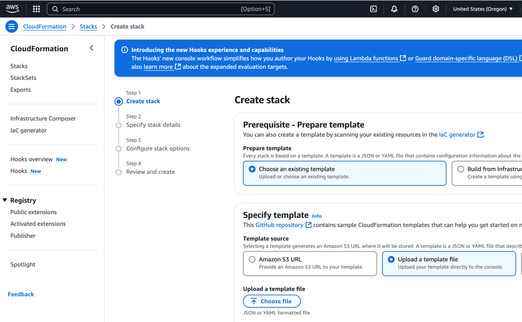 I upload this YAML template by going to CloudFormation > Create Stack > Upload a template file, and upload the template file: