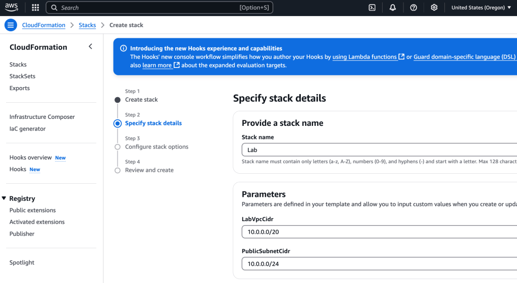 I provide a name for the stack and give parameter values as requested for CIDR range (VPC) and public subnet. Typically, working with Terraform (TF, going forward), I add those as a variable which is passed in to the main file, though the option to ask user input is there, too: