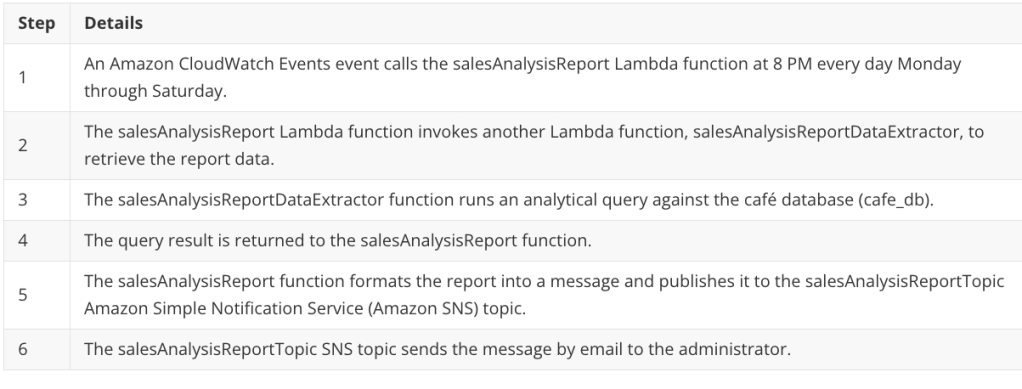 The DataExtractor function runs an analytical query against the DB, using PyMySQL Python library to access MySQL DB. The returned values are provided to salesAnalysisReport function, which formats the data into a message- emailed to clients subscribed to the topic.