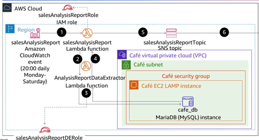 Goal: deploy and configure an AWS Lambda based serverless computing solution, the function of which will generate a sales analysis report by pulling data from a database and then emailing the results on a regular basis. The database secrets (username, password, etc) are stored in the Parameter Store of AWS Systems Manager, while the DB is part of an EC2 LAMP instance. Details Involved will include: