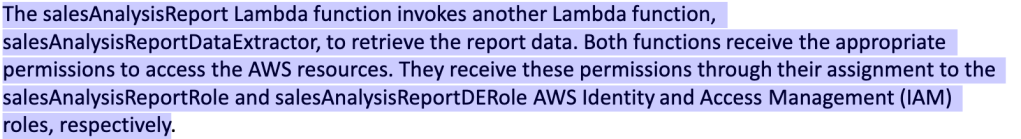 There are two roles, the first is salesAnalysisReportRole. That has four permissions policies attached to it: AmazonSNSFullAccess, AmazonSSMReadOnlyAccess, AWSLambdaBasicRunRole, AWSLambdaRole.