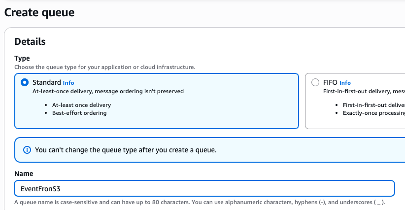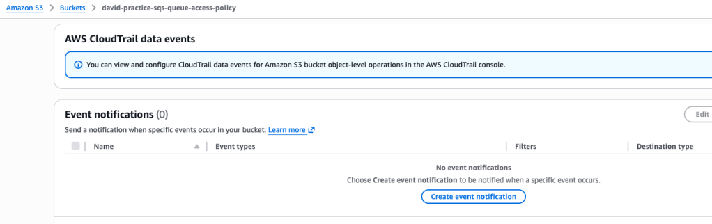 In this exercise, we’re going to practice setting permissions and configuration so once an event occurs within an s3 bucket, that event notification will be sent to the SQS Queue.