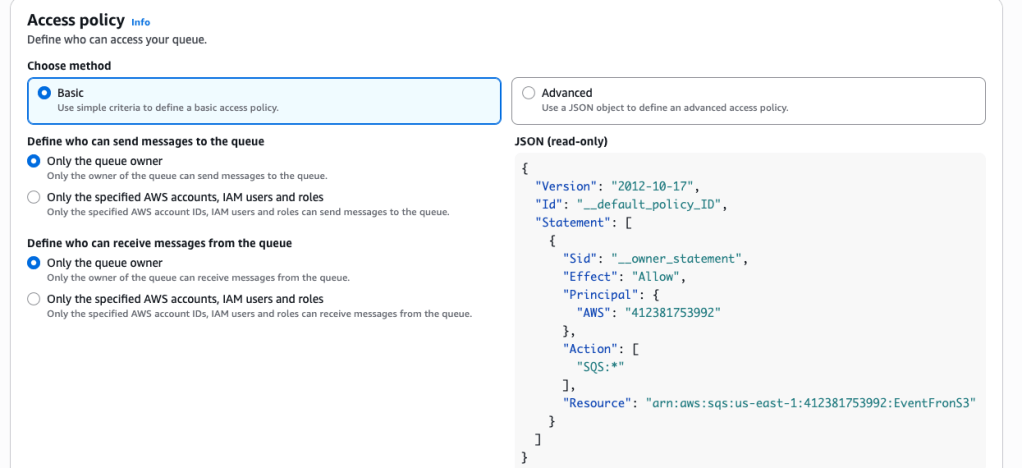 Essentially, this Access Policy allows the S3 bucket to send message to the Queue.