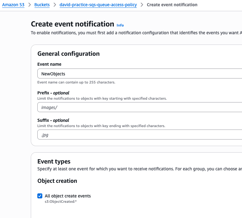 "Resource": "arn:aws:sqs:us-east-1:123456789012:MyS3Queue",