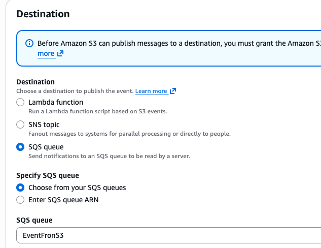 Then we scroll down to Destination, and select the SQS queue created earlier (typo in naming I see!):