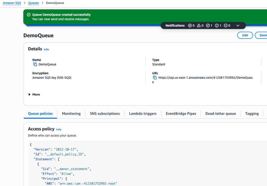 Access policy: who can send messages to the queue? And who can receive messages from the queue? For this exercise, just the owner (me) will be able to: