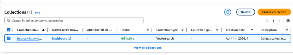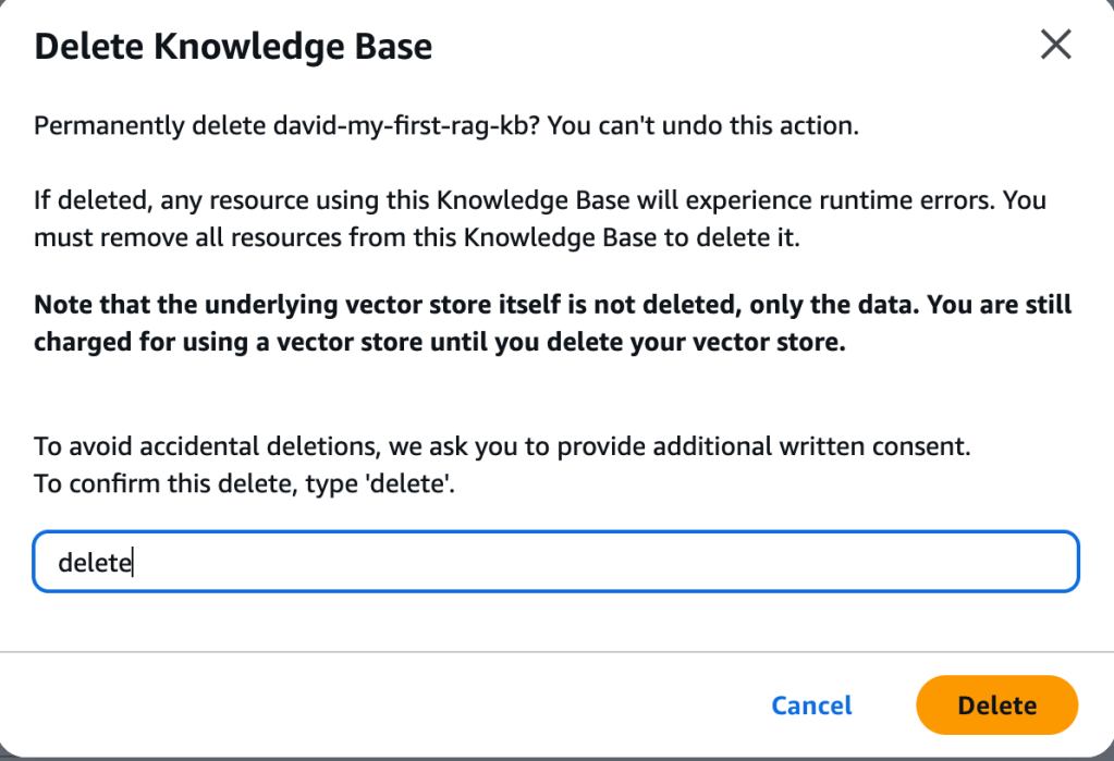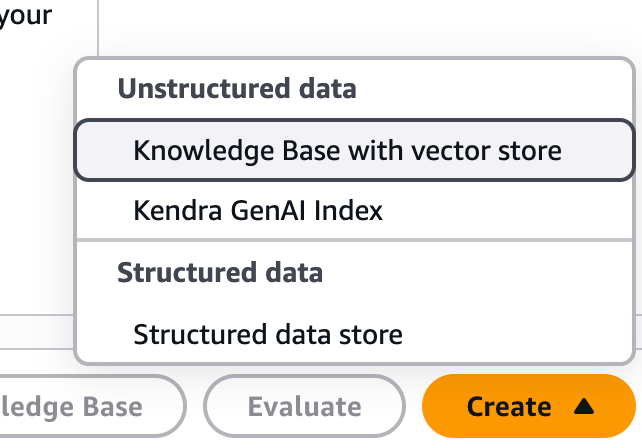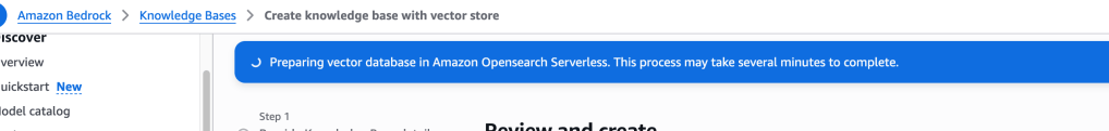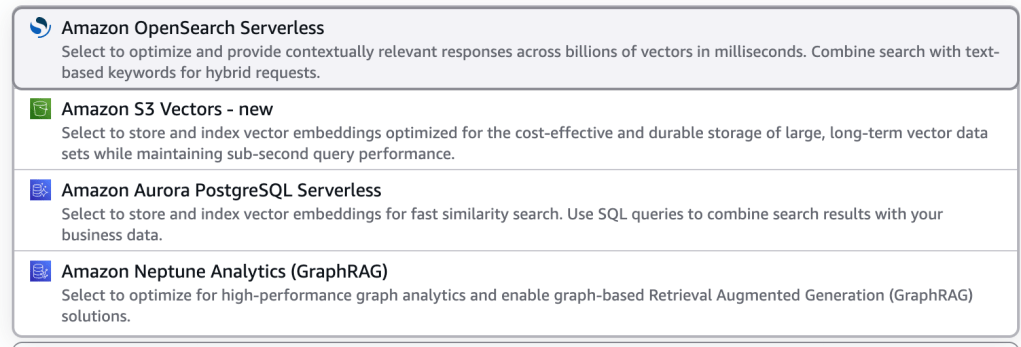 Next up we create a Vector Store. There’s a couple of options – S3 looks good because it’s more inexpensive, but I’m going to select the OpenSearch Serverless.