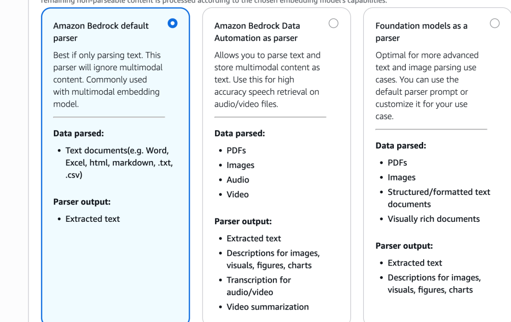 Now, we have some data (the book) in S3 that we can use to ingest into a vector database. It’s just text so the default parser will be just fine: